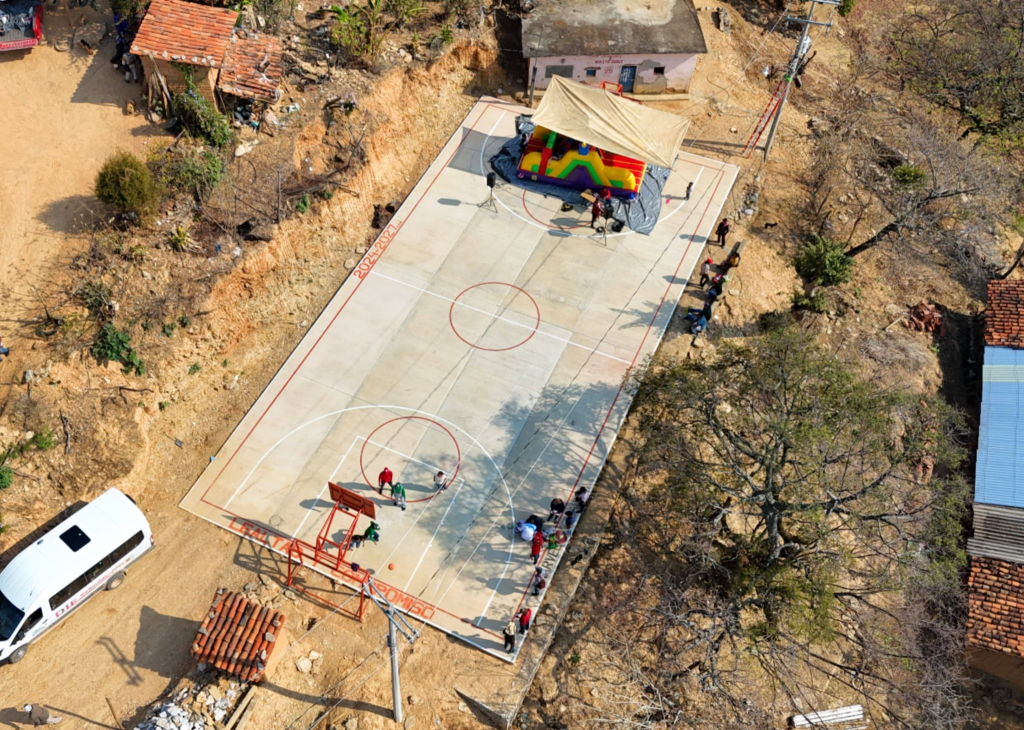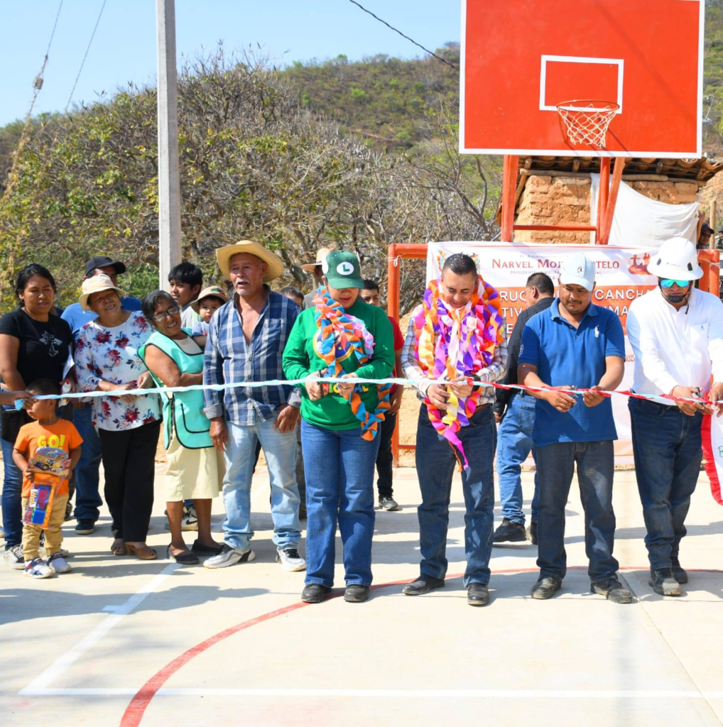 El Presidente Municipal *Narvel Mojica Sotelo*, junto a la Presidenta del DIF *Araceli Guevara Cervantes* y el Director de Obras *Ing. Gustavo Bustamante Sánchez*, fue recibido emotivamente por el comisario municipal y entregó una cancha deportiva de concreto hidráulico en la Primaria Benito Juárez de la comunidad de «El Duraznal».